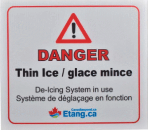 Noter que si votre compresseur fonctionne en hiver, il gardera certaines zones du plan d’eau libres de glace ou créera de la glace mince et instable. Pour des raisons de sécurité, vous ne devriez pas patiner, marcher ou pratiquer de sports d’hiver sur le plan d’eau. Installez toujours des panneaux visibles «Danger: glace mince» autour de l’espace déglacé pour aviser toute personne du danger.